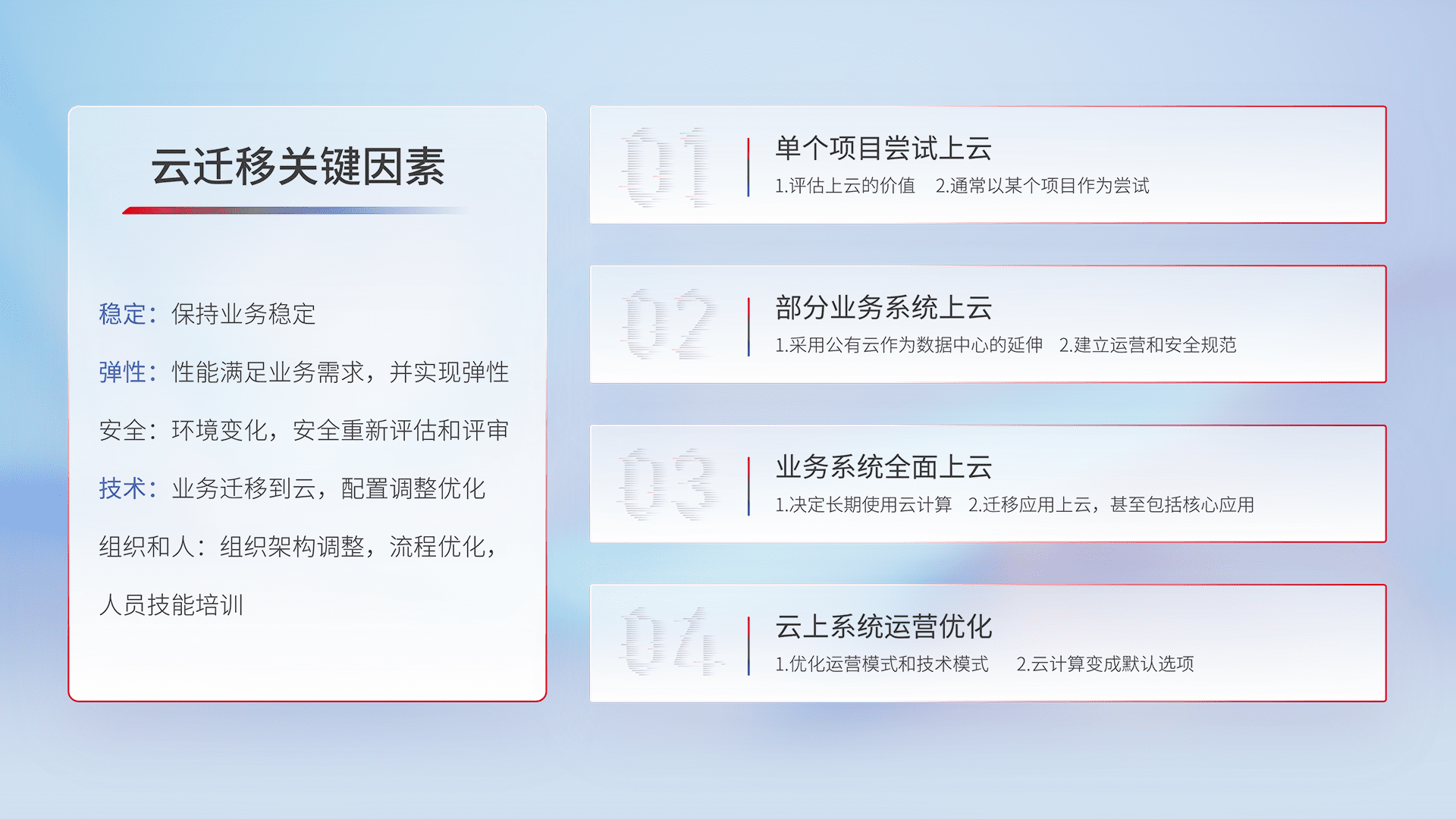 结合实际业务,,,从规划设计、、、云平台选型、、、、云原生改造、、、数据迁移、、、、集成交付,,,,迁移全过程为客户识别最佳上云路径,,做好风险识别管理,,设计网络架构、、、身份权限、、安全审计合规、、、、操作审计、、日志审计、、、、监控告警策略、、多站点容灾设计等,,,,对云上基础设施进行整体规划,,提升IT治理水平,,以满足弹性、、高可用、、、、高性能的需求。。