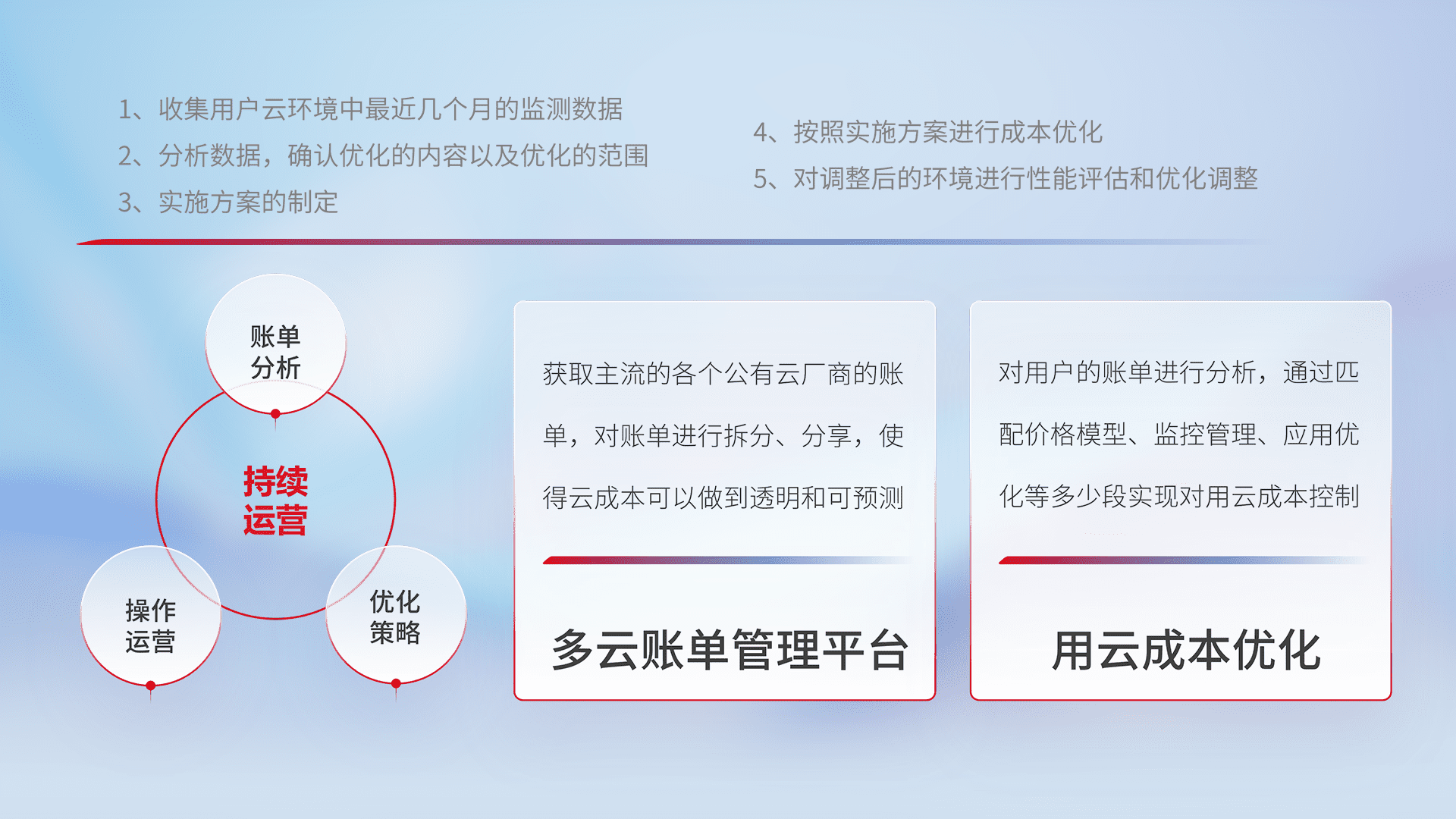 通过多云纳管,,,以统一的资源数据模型把客户的云资源进行抽象和封装,,,进而实现对多云资源的统一操作,,保障云资源管理的可靠性、、、、稳定性与可用性。。。。量身定制化运维内容,,配置、、、开发运维、、补丁管理、、备份、、、监控、、、认证和访问管理、、、审计和日常巡检等,,保障在用云过程中的可靠度,,稳定度以及高可用率。。